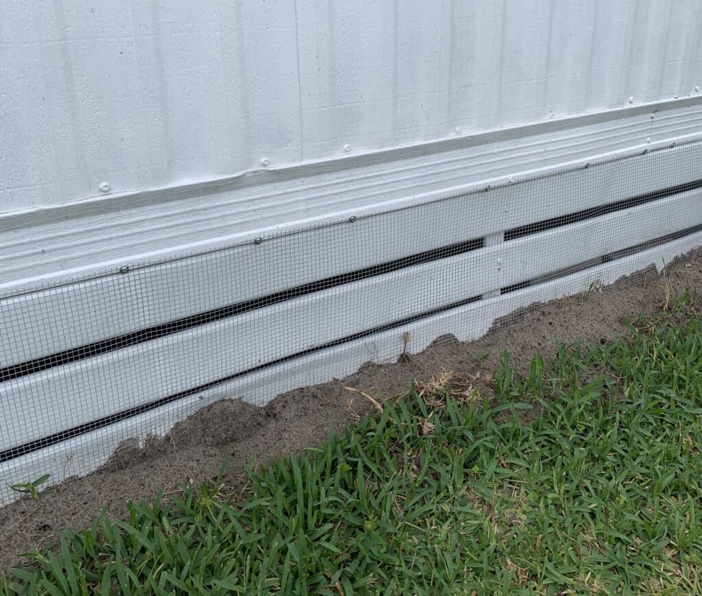 Detailed image showing a fully completed wildlife exclusion beneath a mobile home in Pebble Creek, Florida. The home’s foundation, skirting, and ground vents are securely protected using robust, rust-resistant ¼-inch hardware cloth barriers. These barriers have been carefully buried underground, firmly tap-conned to concrete foundations, and wrapped securely behind skirting and ground vents. This professionally completed installation permanently excludes rodents, snakes, raccoons, armadillos, opossums, and other wildlife pests. Essential airflow is maintained through vents, demonstrating superior effectiveness compared to temporary solutions such as traps or bait stations.