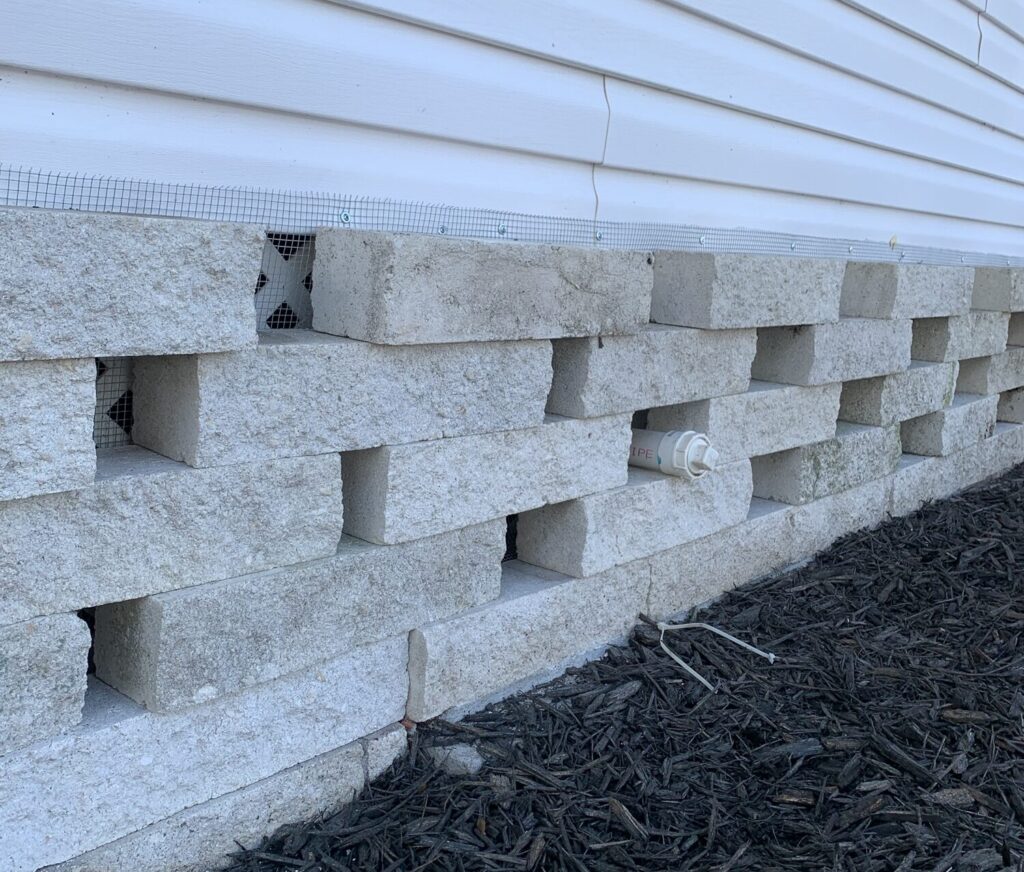 Detailed image of a fully completed wildlife exclusion installation beneath a mobile home in Riverview, Florida. The foundation, skirting, and ground vents have been securely protected by robust, rust-resistant, ¼-inch hardware cloth barriers. Carefully installed by burying beneath soil, tap-conning to concrete foundations, and wrapping interior skirting and vents, this installation prevents entry from rodents, snakes, raccoons, armadillos, opossums, and other wildlife. It ensures necessary ventilation is preserved while delivering permanent, guaranteed protection. This professionally completed exclusion clearly highlights its superior effectiveness compared to temporary solutions such as bait stations or traps.